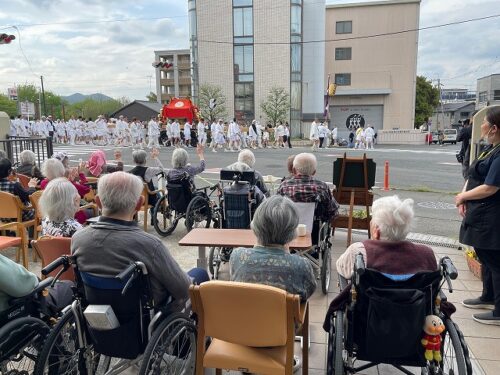 施設の玄関ではお神輿が通るのを今か今かと待っています。