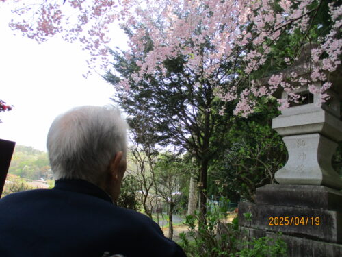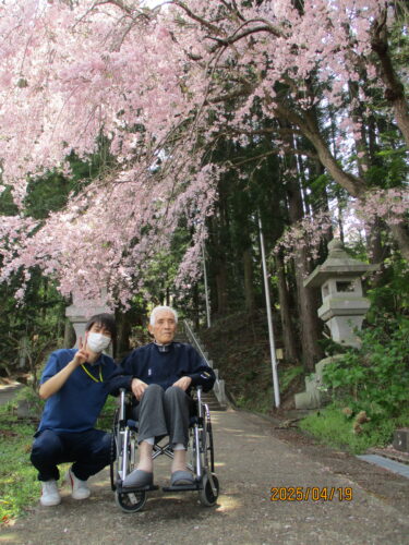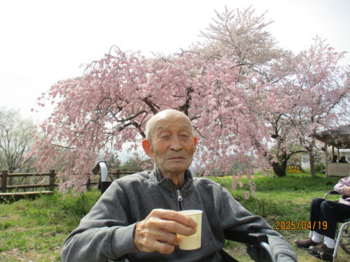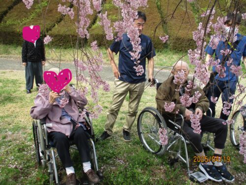 しだれ桜に酔いしれる入所者様。。風に揺られ、花びらが散る桜の姿もまた、良いものです🌸
