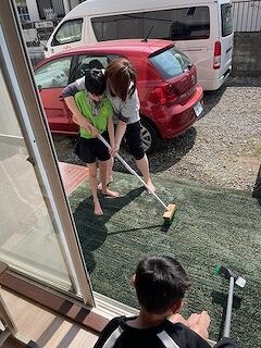 冬にみんなが使っていた絨毯をブラシを持ってゴシゴシと