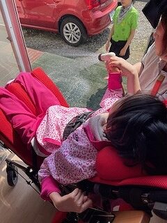 バギーのお友達も窓口からホースを職員と一緒に持って🚿