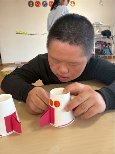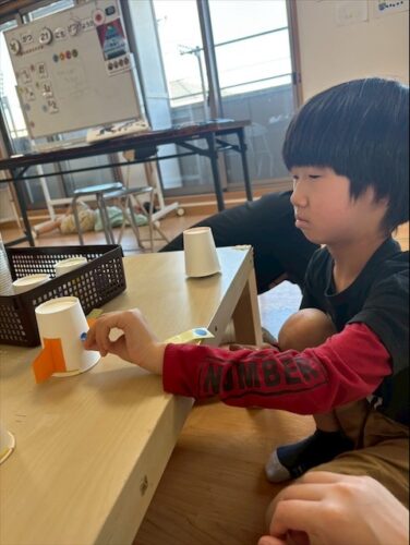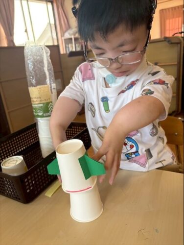 最後には土台の紙コップの上に自分の作った紙コップを乗せて飛ばす活動をしました。
