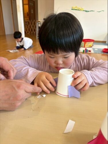 紙コップにシールを貼ったりペンで絵を描いたり自分でロケット🚀作りをしました。