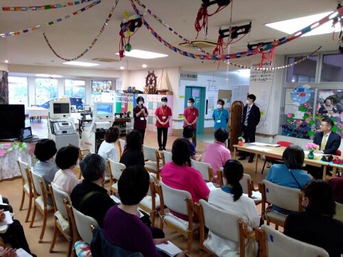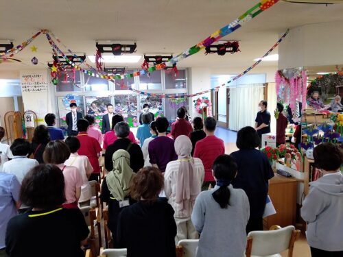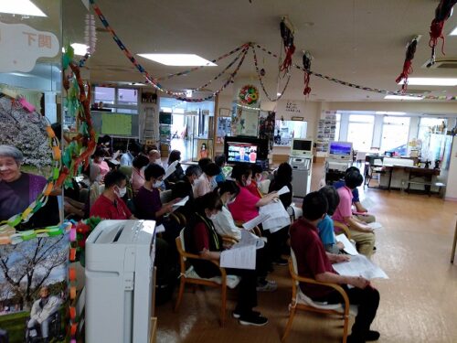 職員全身でさわやか倶楽部の社歌を歌っています。