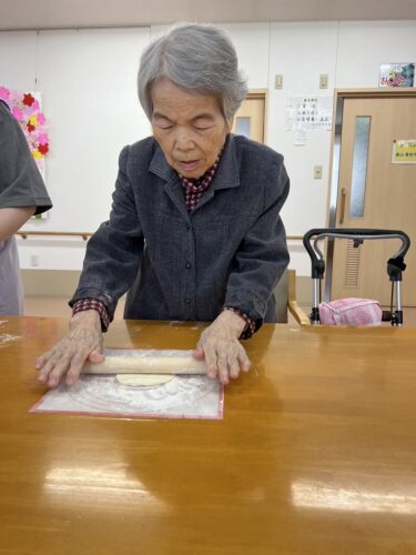 みなさん真剣な表情でパンの生地を伸ばしてくれています。