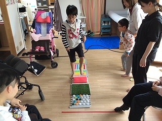 お友だちは、足を大きく上げてマットの上を歩くよ😁