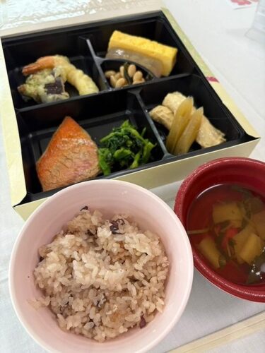 さわやかかぬま館 周年祭の特別食【さわやかかぬま館】 2025-04-30 2025-04-28 こんにちは☺ 10周年祭の昼食を紹介します🍱✨ 厨房さんも朝から大忙しです! お赤飯、お味噌汁、天ぷら、魚の煮付け、湯葉とふきの煮物、厚焼き玉子、煮豆でした🍱☺ いつもとは違う松花堂弁当での提供に利用者様も喜んでくださいました🌸 担当♡見目