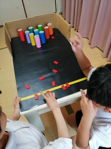 集団活動は、プラスチックドミノを指ではじいて遊ぶゲームをしました。
