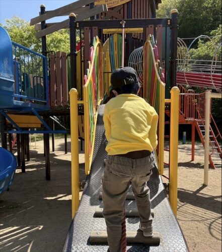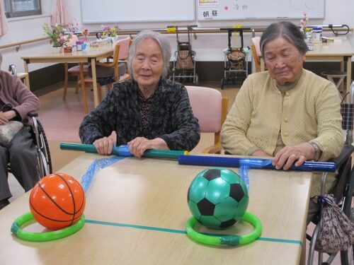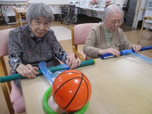 棒につけたビニールテープの端に、バスケットボールがあり、そのボールを