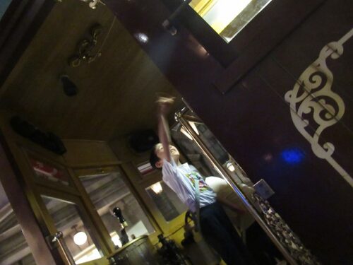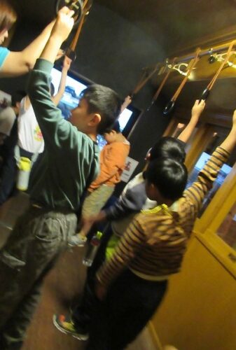 吊革につかまってみたり、鐘を鳴らしてみたりと