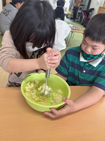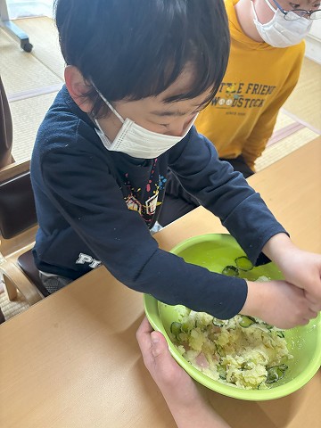 お友達と協力しながらジャガイモをつぶす姿も見られました😊