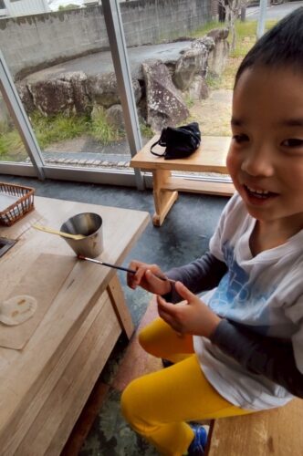 次はお醤油をハケや筆で塗ります。絵を描いたり、字を書いたりしました🖌️
