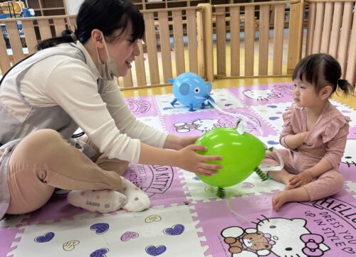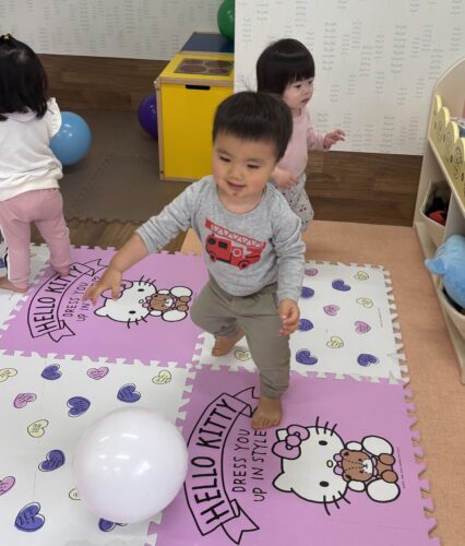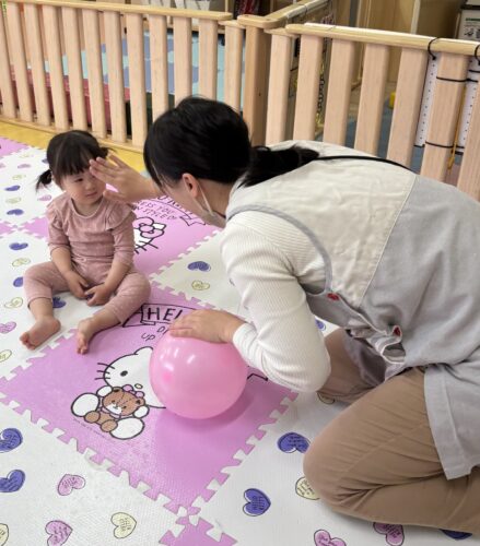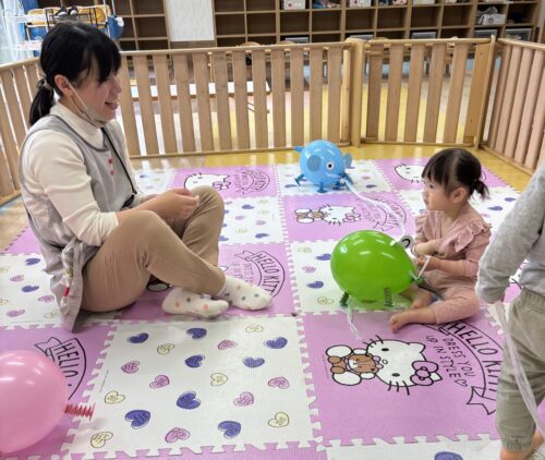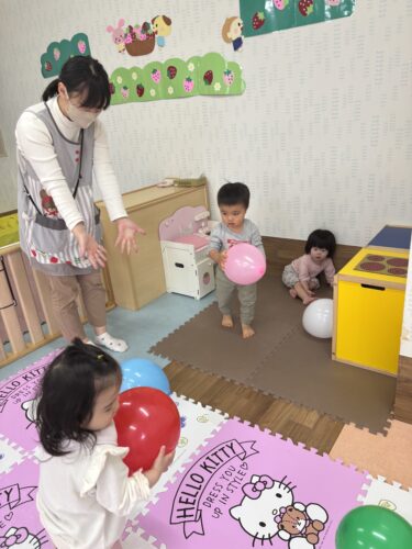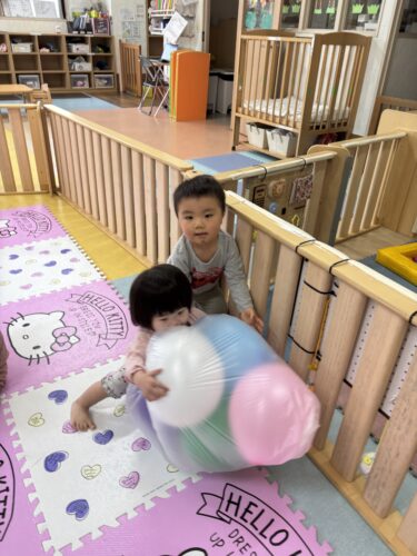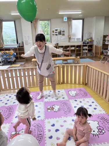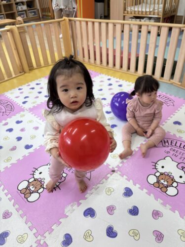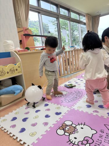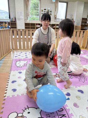 以前、風船を少し怖がっていたお友だちも慣れて投げたり、蹴ったり、追いかけたり