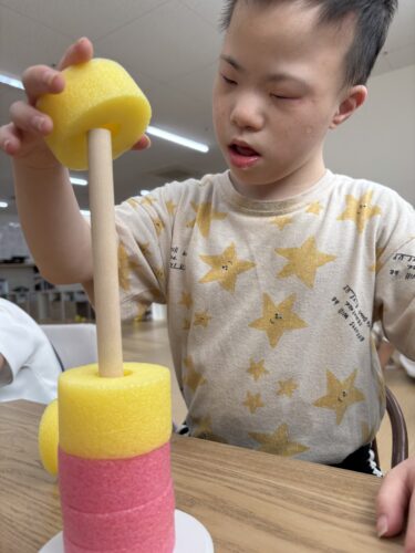 よく手元を見て棒にさしています👀