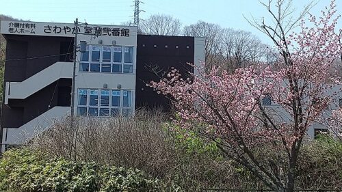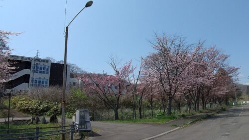 施設横 川沿いの桜並木が見頃を迎えています