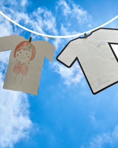 皆さんがデザインしたTシャツとソックスが干してあります🧦