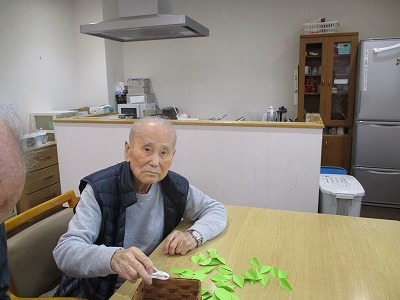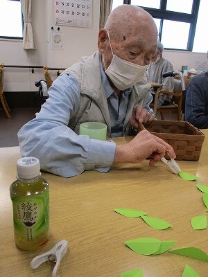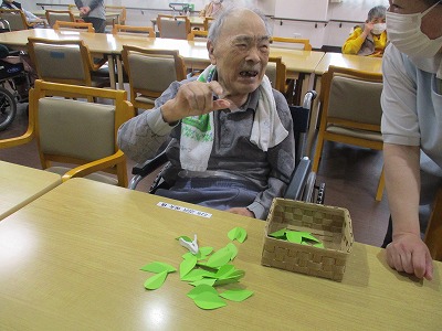 洗濯バサミで1分間葉っぱをつんでもらい、一番多くつめた方には