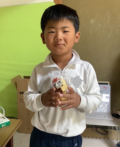 カステラ、さくらんぼ、生クリーム、カラフルチョコスプレーの四つです。