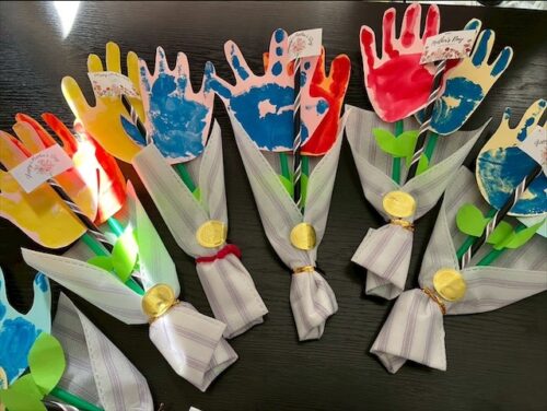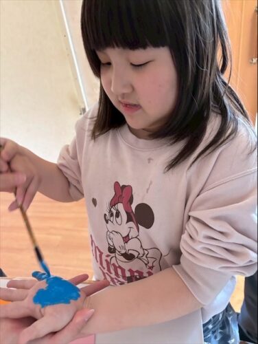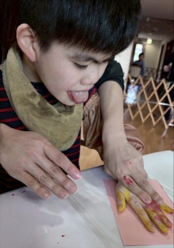 好きな色の画用紙と絵の具を選び、画用紙に手形をぺたん!