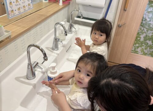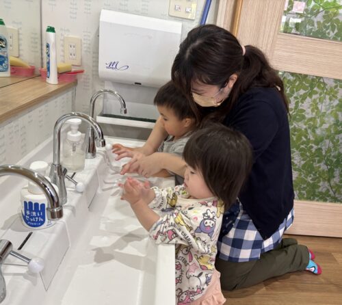 外から帰って来たり、トイレの後、食事の前には手洗いをします