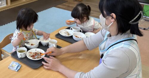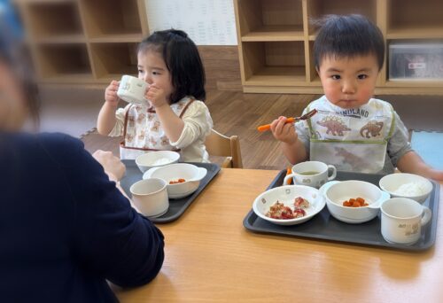 スプーンやフォークを上手に持って食べたり、苦手な物も頑張って食べています