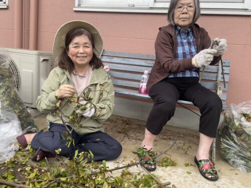外での作業は大変ですが気分転換になっていい、手が疲れるけどリハビリになるね