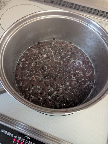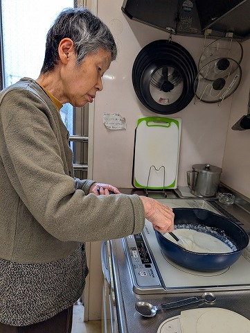 生クリームに抹茶を入れて、牛乳にゼラチンなど鍋でグツグツ温めました。