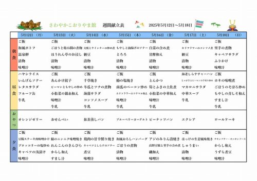 さわやかこおりやま館 今週の献立表🍚☆さわやかこおりやま館 2025-05-12 2025-05-12 こんにちは、さわやかこおりやま館です(^▽^)/ 今週の献立(5/12~5/18)こちらになります🍚 担当:千葉