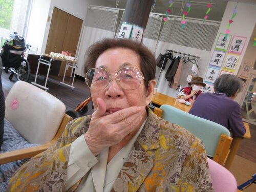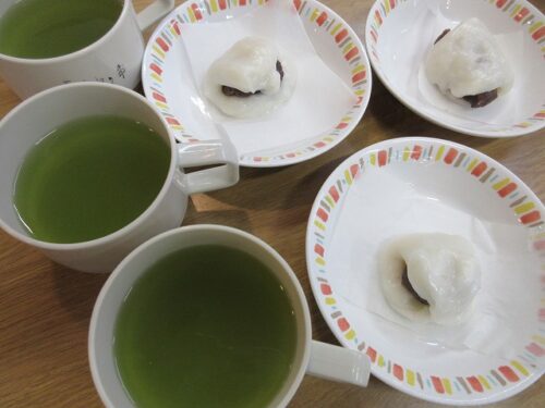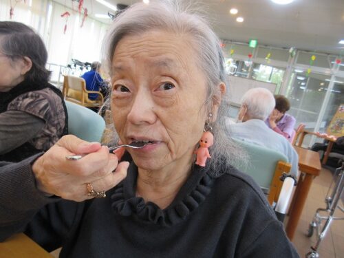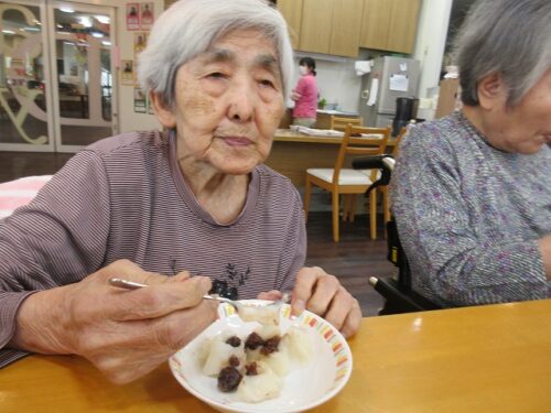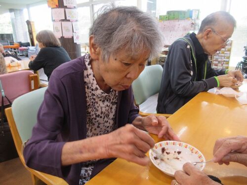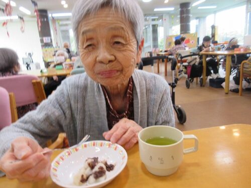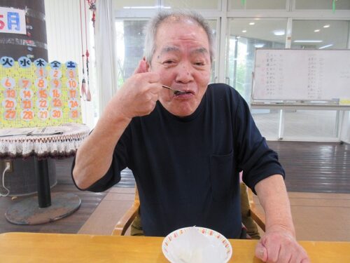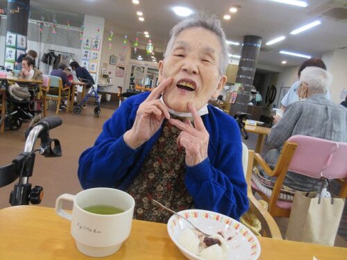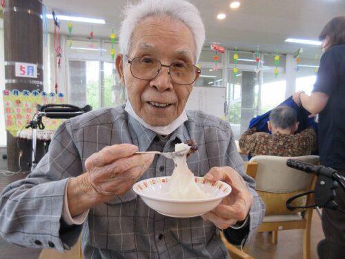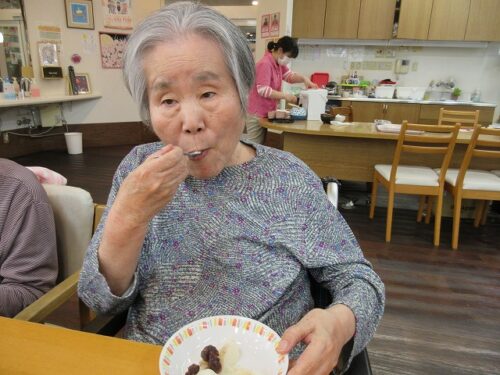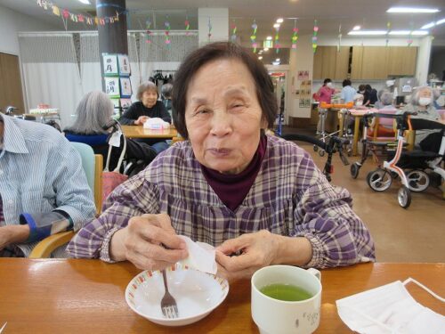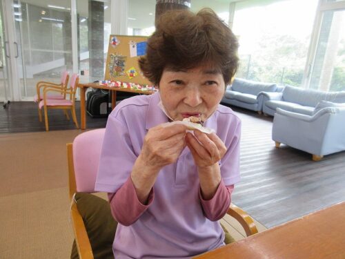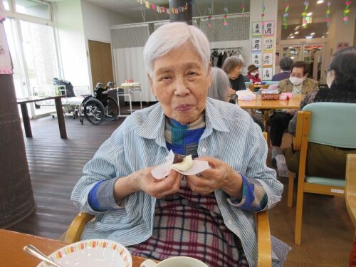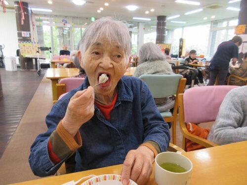 先日、二日間にわたり職員手作りのおやつを皆様に召し上がって頂きました。一日目は柏餅風だんごです。お餅は危ないのでお団子にさせて頂きました(笑)