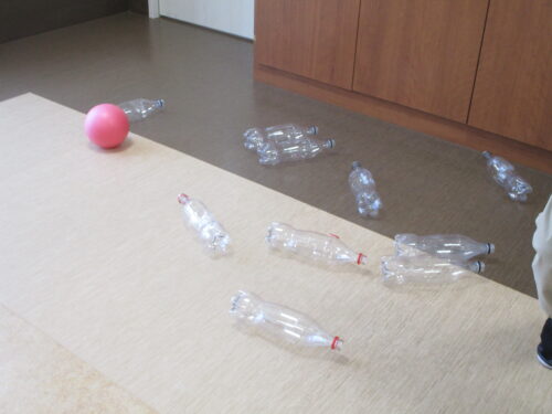 皆様、投げ方を教わってきれいにボーリングのピンに向かって投げてますね。