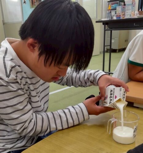 牛乳を計り入れて、砂糖と一緒にしっかり混ぜます。