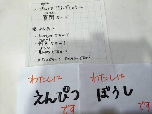 前に出た人にカードを1枚引いてもらって隠し、そのカードに書いてある何者かを、みんなの質問で当てるのですが