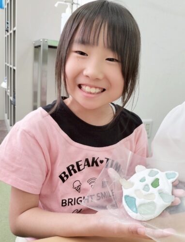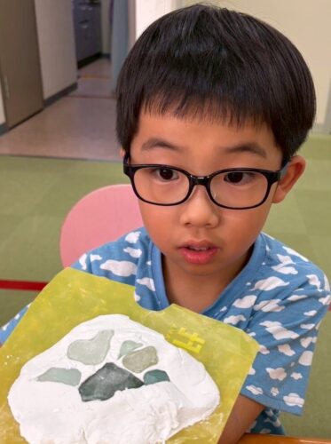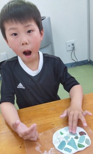 紙粘土をよくこねて、好きな形にします。どの色にしようかな〜 決まったら紙粘土に押し付けていきます。