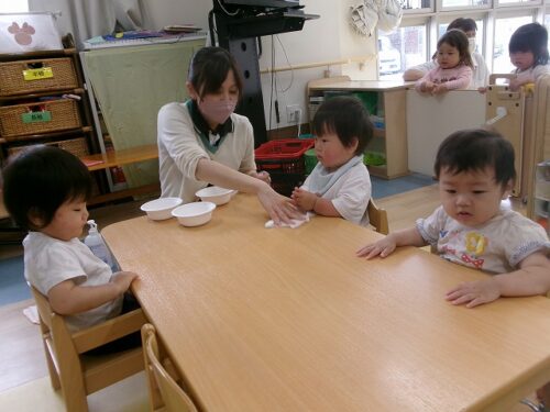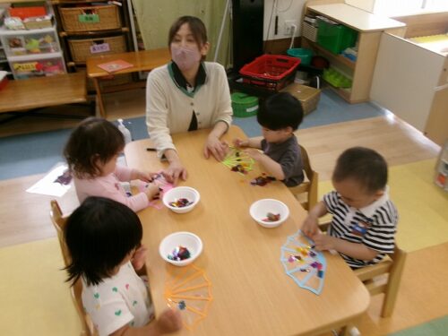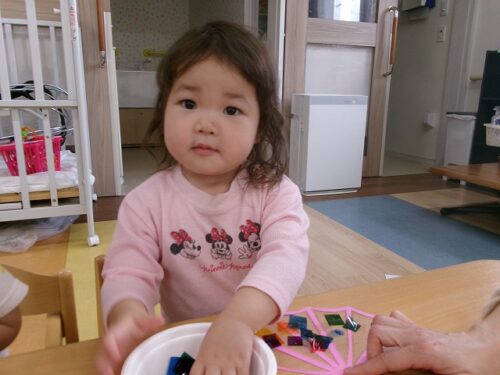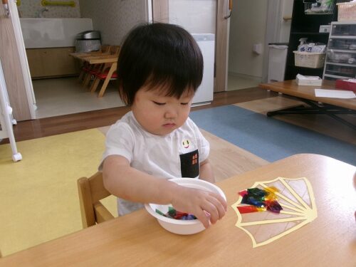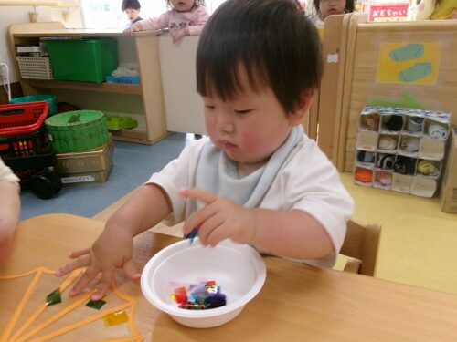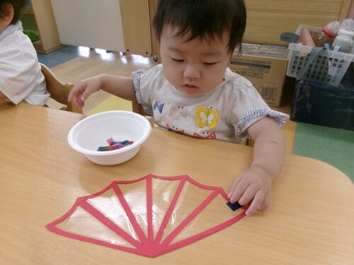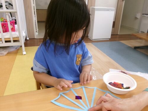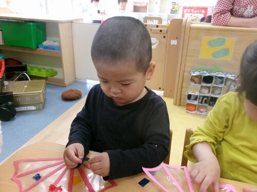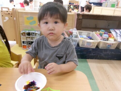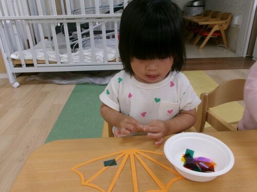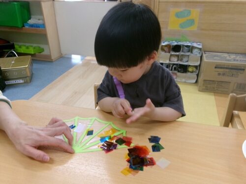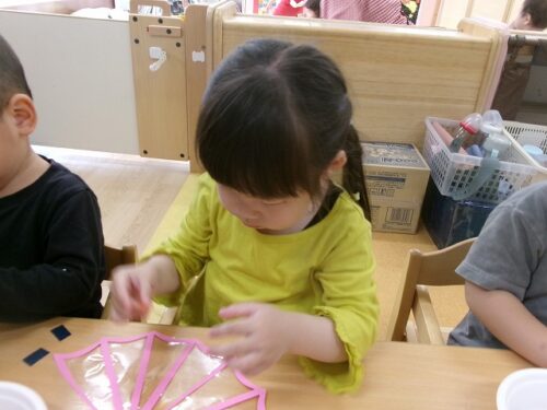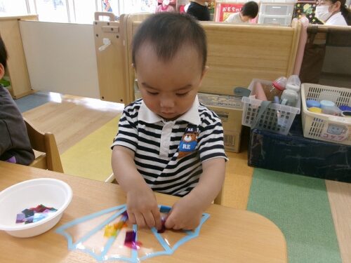 2歳児さんたちはくっつけるカラーセロハンに興味深々…