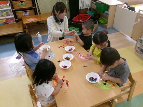 カラーセロハンを一つ一つくっつけていくお友だち、たくさんのせてバンバンバンと叩いてくっつけるお友だち