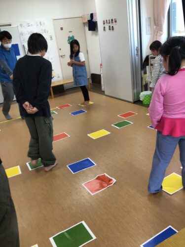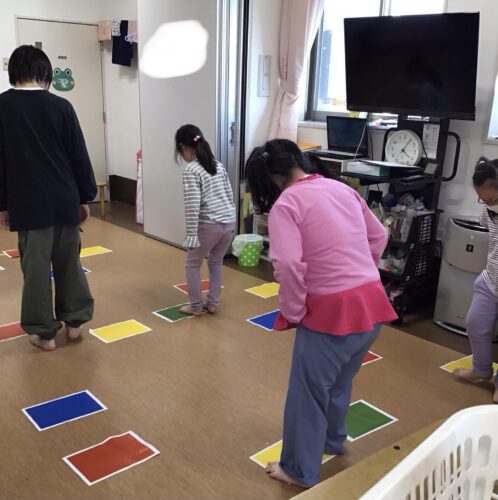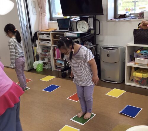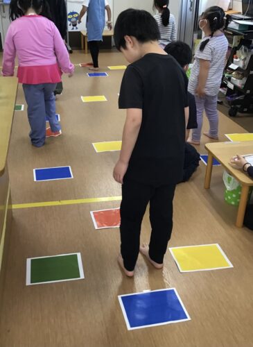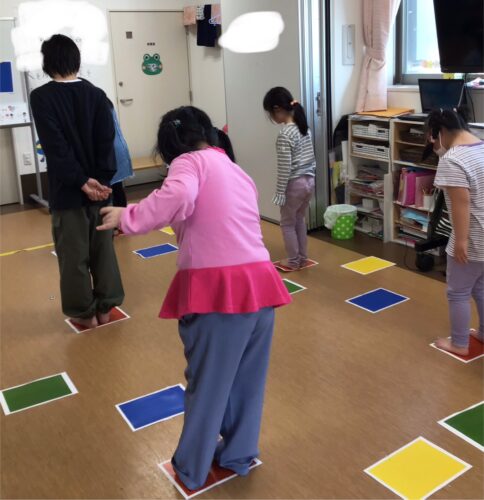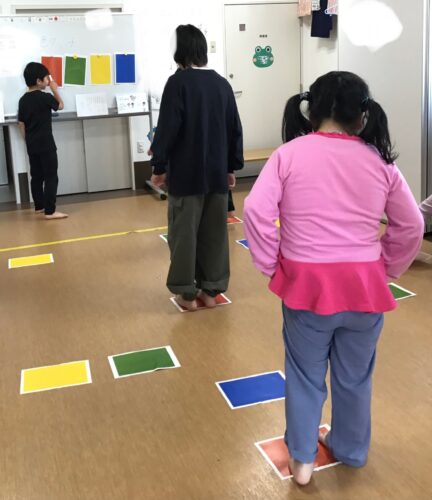 🟥🟦🟨🟩の四色の紙を床の前後左右に貼って、