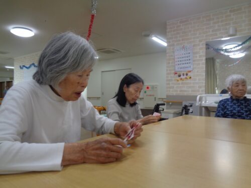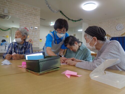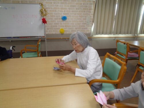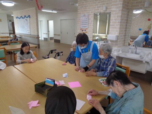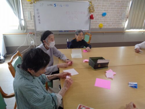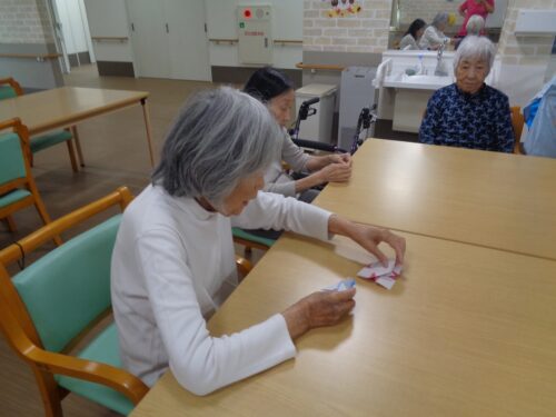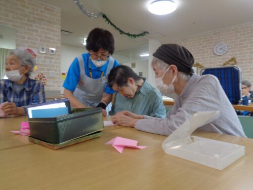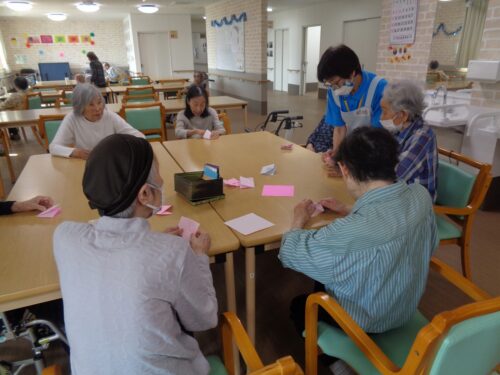 こちらは室内で折り紙レクリエーションです🟩✂️
