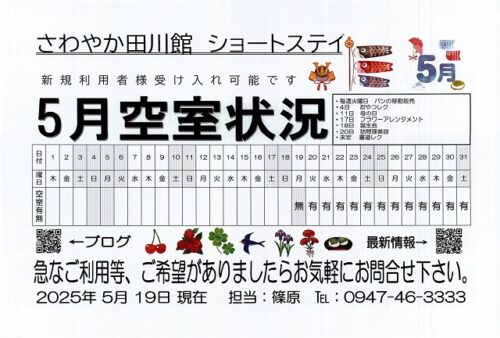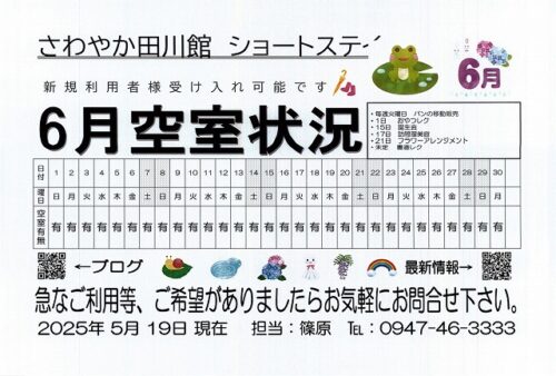 ショートステイの空室状況 5月/6月 [さわやか田川館]