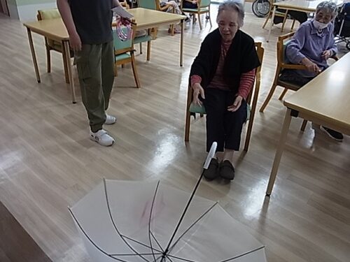 さわやか室蘭弐番館 2階 17日午後の様子♪ 2025-05-19 2025-05-19 皆様こんにちは♪ 更新が遅くなりました 17日午後の様子をお届けします おやつ前に輪投げを楽しみました 揺れる傘目掛けて それ~ 第一投目です 笑い声が響いた2階でした☆