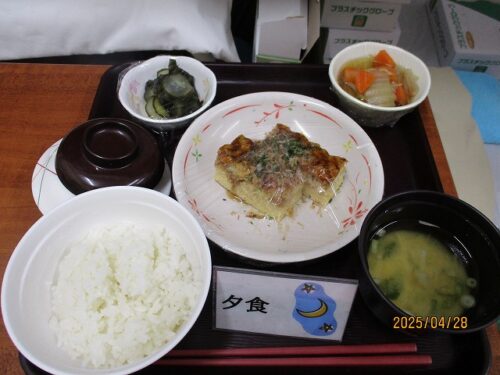 ご飯・お好み焼き風玉子焼き・白菜の煮物