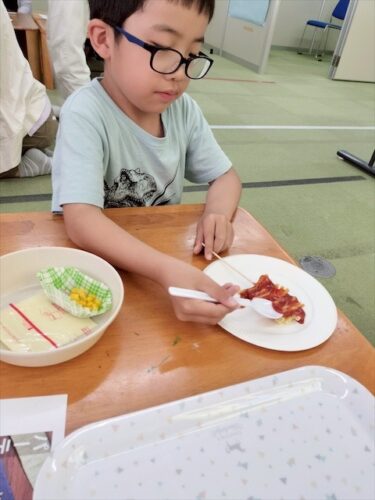次に、刺したマカロニに、ケチャップかピザソースをスプーンで塗り広げます🥄