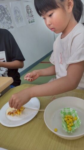 最初に、マカロニを20本横向きで、竹串に刺していきます!