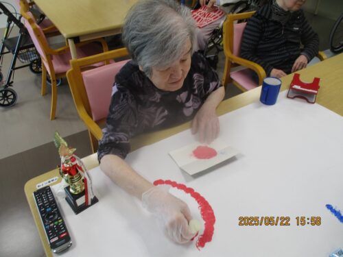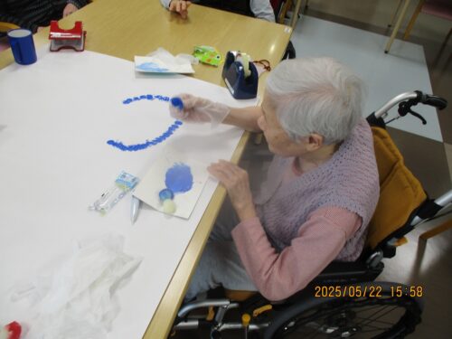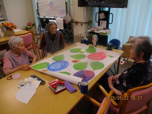 おやつ後に紫陽花の壁紙づくりを行いましたが、少し疲れておられる方が多く、少数になりましたがきれいな紫陽花の壁画が出来て作った方は嬉しそうに拍手をしておられました。