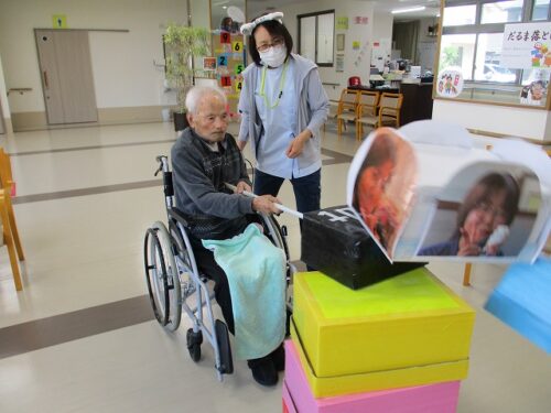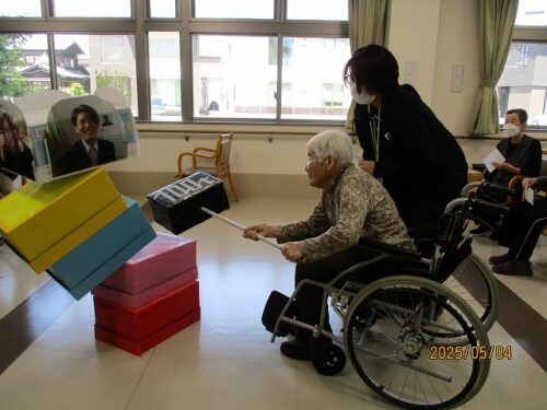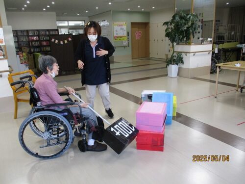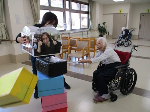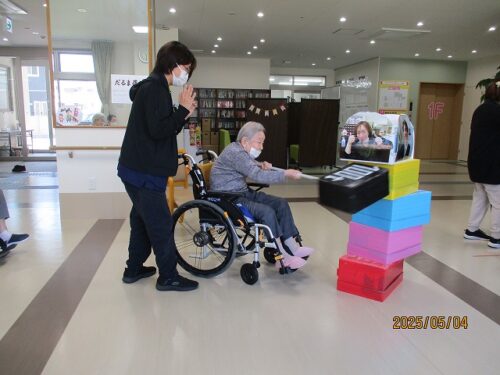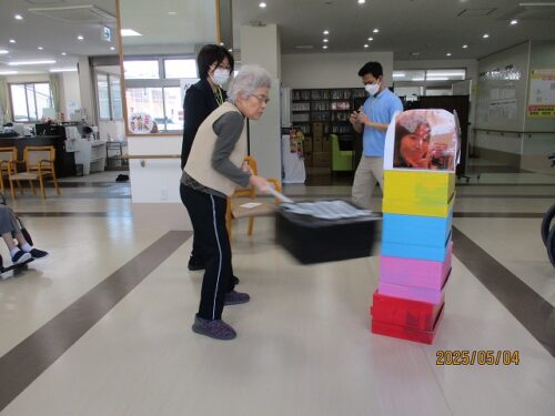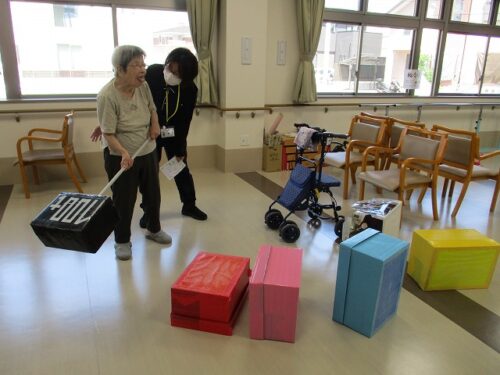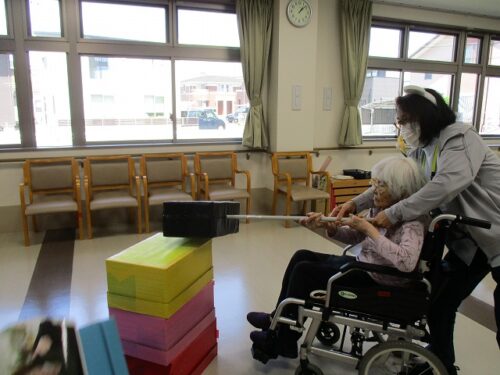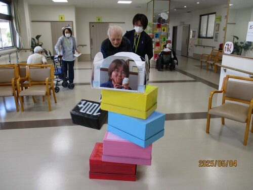 頑丈に作れてしまい、入居者様が積み木(箱)を落とせるか心配していたのですが、