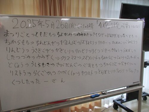さわやか室蘭弐番館 3階 26日活力朝礼♪ 2025-05-27 2025-05-26 皆様こんにちは♪ 昨日の様子をお届けします 一日のスタートはラジオ体操です 続いて頭の体操 4文字・5文字で文字つなぎです 笑い声溢れる一日になります様に☆