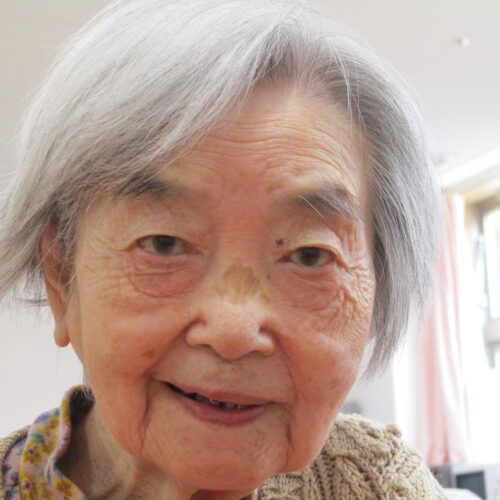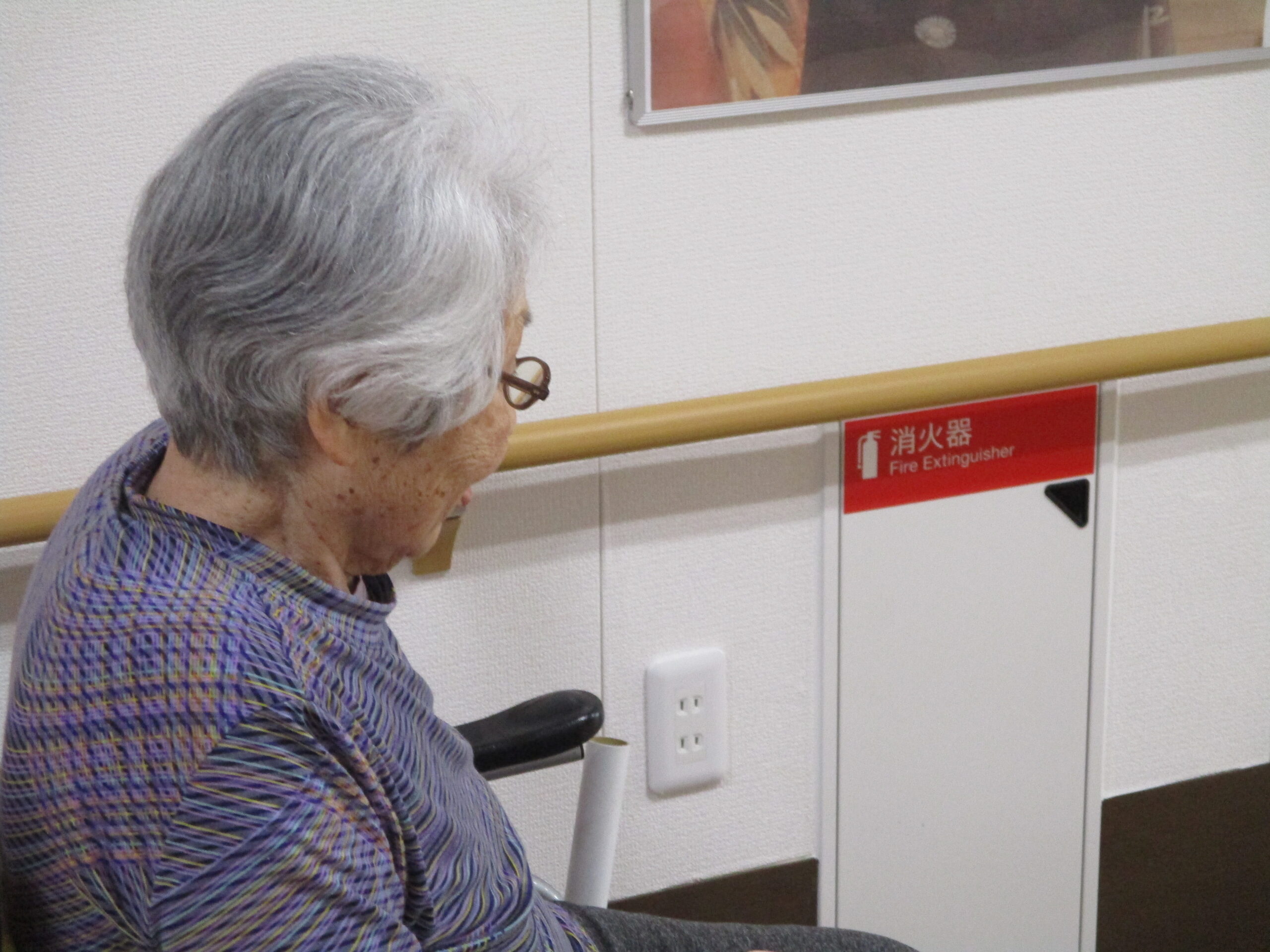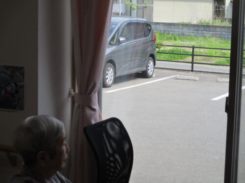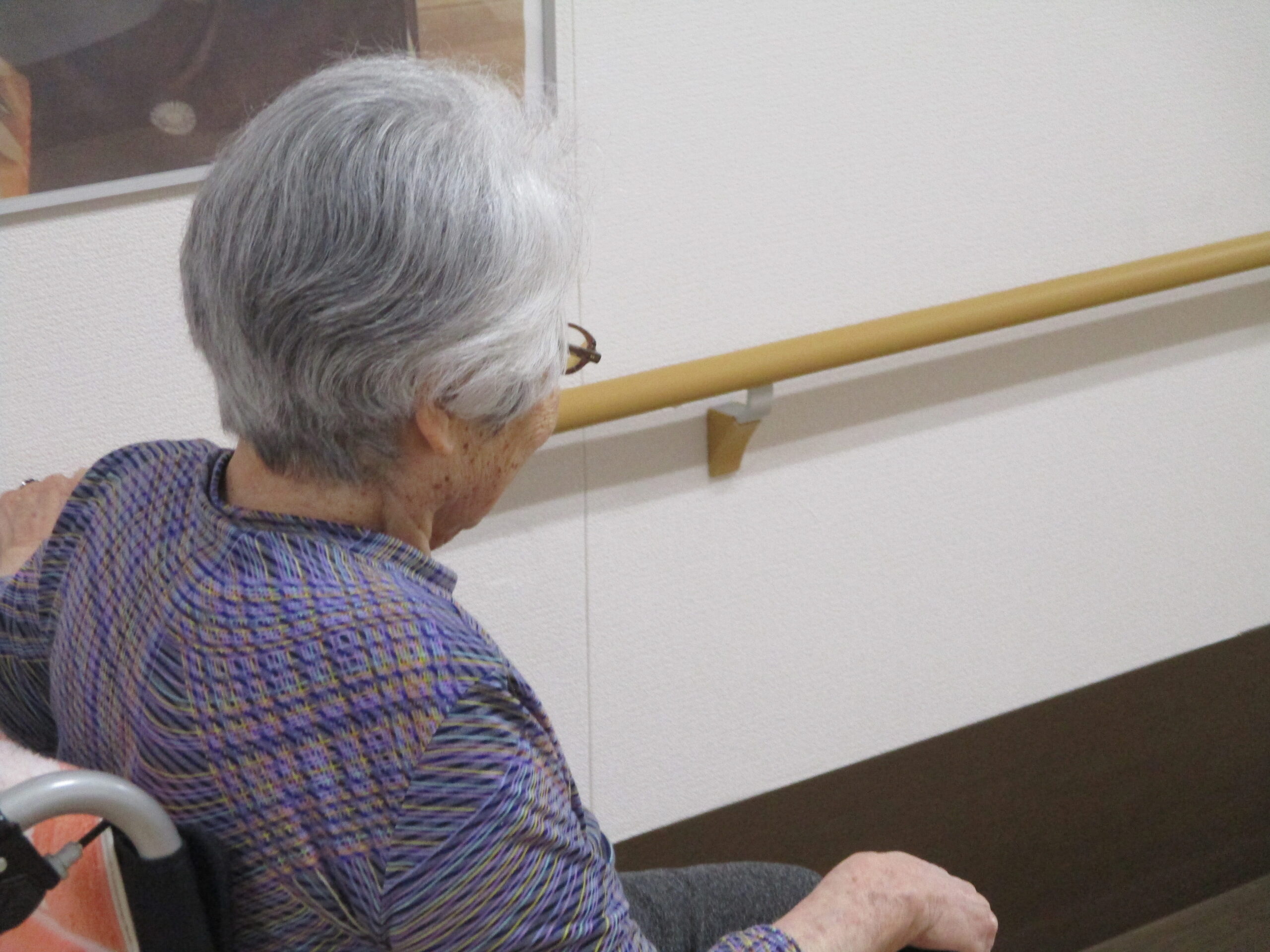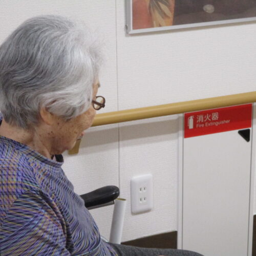 自力で車椅子を操作しゆっくりと歩いている様子ありました。「自分で外まで歩く練習してるの。」と笑顔で話されておりました。