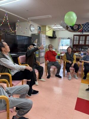 全員で輪になり、風船を落とさないようにパスをしていきます