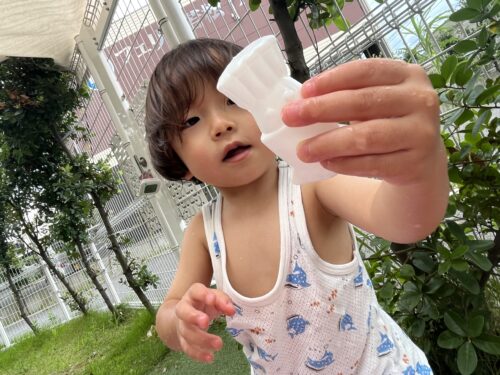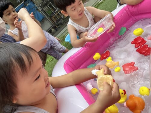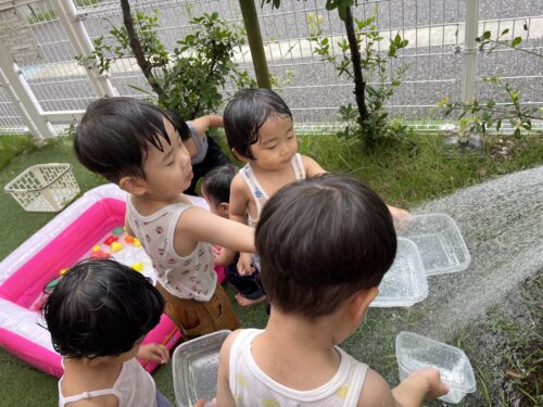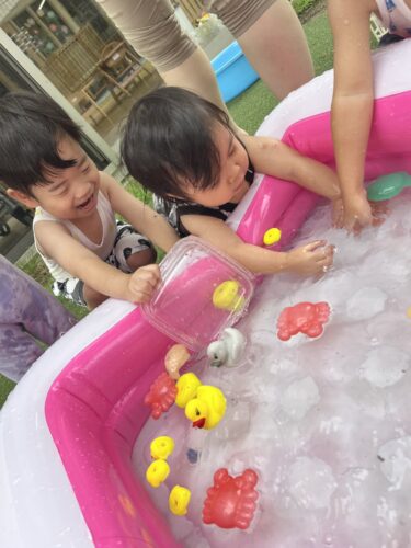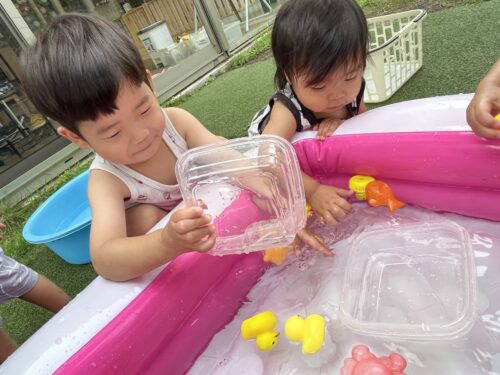 少しずつ慣れてきて水遊びを楽しんでいました‪