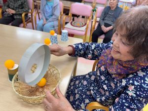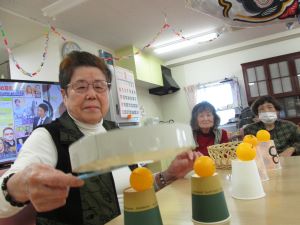 すくったピンポン玉を紙コップの底に乗せるゲームです。