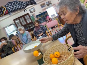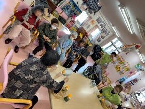 2つのチームに分かれて、紙で作ったラケットでピンポン玉をすくいます。