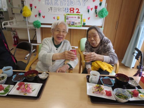 さわやかグループホーム なすしおばら 未分類 すいせんユニットの様子 【お誕生会その①】 2025-05-28 2025-05-28 5月24日は澤田敬子様、82歳のお誕生日でした🎉 ユニットの皆様がお料理やケーキ🍰を手作りして下さり とても暖かいお誕生会になりました。 お祝い事はみんな笑顔でご馳走が食べられて楽しいですね(*^_^*)
